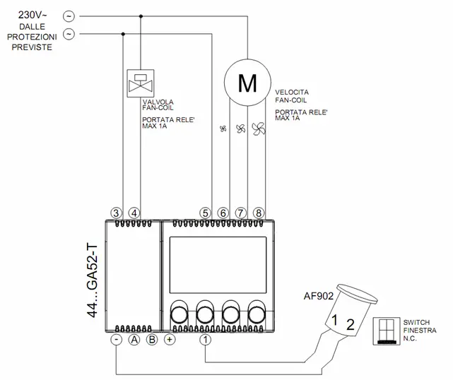 The thermoregulation, managed by the thermostat 44.GA52-T can be inhibited through a contact (Cod. AF902) mounted on the window of the room. Below the wiring diagram of the configuration with window contact.