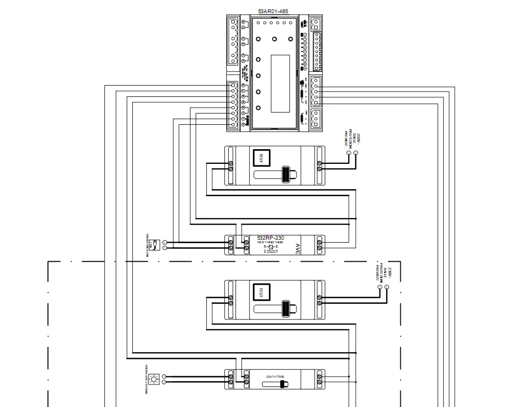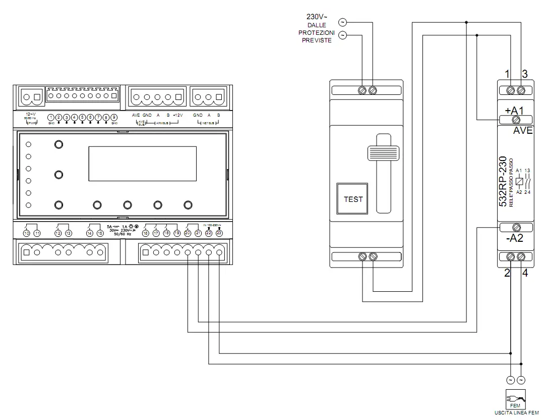 The connection of the room relay that manages the FEM is controlled directly by the room control unit 53AR01-485 and must be connected as shown in the scheme below.