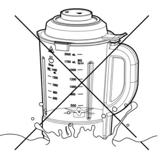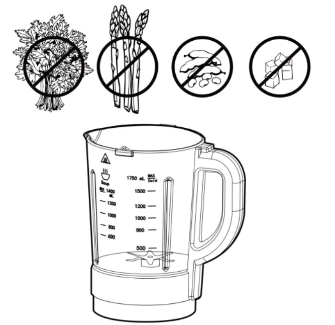WARNING! The min product level in the blender is 750ml. Do not exceed the max level for hot liquids (1200ml) and cold liquids (1500ml), it may cause overflow. Do not open the lid of the blender cup while the blender is in operation. If you hear an intermittent sound of the blade turning when chopping food, this is normal. If you lift the bowl or open the lid of the blender while it is running, the protection will be triggered, and the motor will stop. Do not add sugar, plant stems or legumes (beans, peas, chickpeas, lentils) to the bowl, as the blade can jam, and it can cause damage to the device. To clean the blender blade ⑥ use the brush ⑭ . Before plugging in, make sure that the bowl is securely seated on the blender base and that the bowl lid is closed.