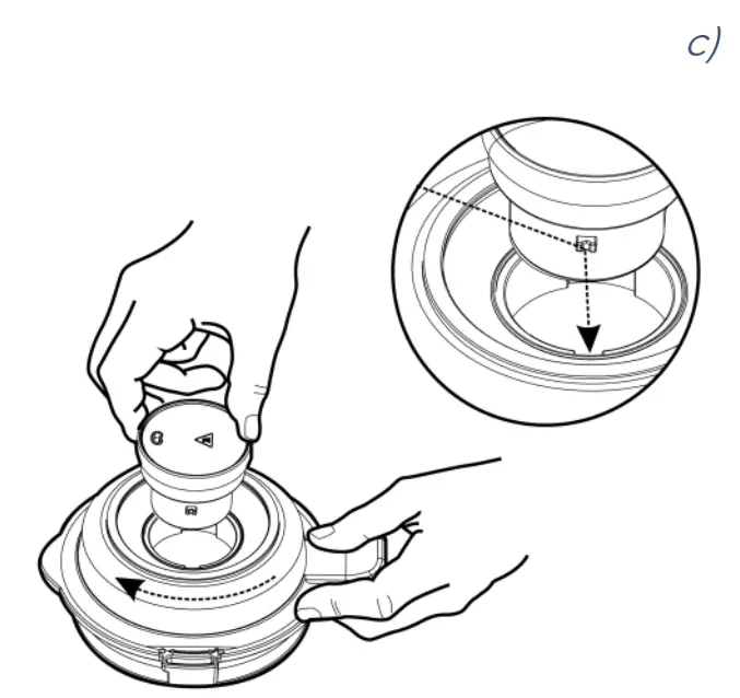 Place food in the bowl ④. Then place the large lid ② on the bowl ③ and turn it clockwise until the grooves on the large lid align with the protrusions on the bowl (See figure b). After that insert the small cap ① into the large cap ② and turn it clockwise (See picture c). To open the large and small lids turn them counterclockwise.