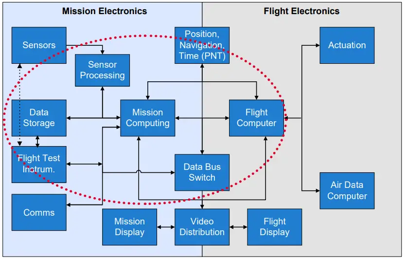 To help describe the fit of these products, a high level view of a classic, generic airborne electronics architecture is shown below. Typically there are two major groupings of electronics on any platform: the flight electronics and the mission electronics. Flight electronics cover major functions that have to do with the movement and management of the aircraft such as flight computer, flight surface actuation, health management, air data computers, air data logging, flight display, etc. Mission electronics encompass functions such as sensors (EO/ IR, radar, lidar, EW, etc.), sensor processing, mission data recording, communication, mission display, and the mission processor. These two categories, while very different in function, do share some capabilities such as PNT (position, navigation and time) and in some cases a common data bus.