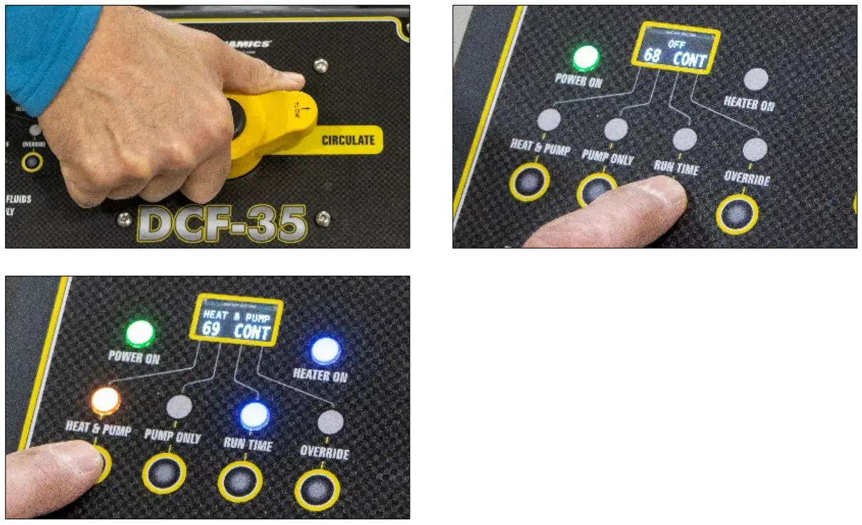 | When the red HEATER ON light turns off, the reservoir temperature is at 130°F and you are ready to flush. Press the RUN TIME button to select the desired flush time as noted when inspecting outlet cooler port above. Position the Flow Control Valve to FLUSH mode. When run time has elapsed, the DCF-35 will turn off and the RUN TIME light will flash. Position the Flow Control Valve to CIRCULATE mode. | ![]() |