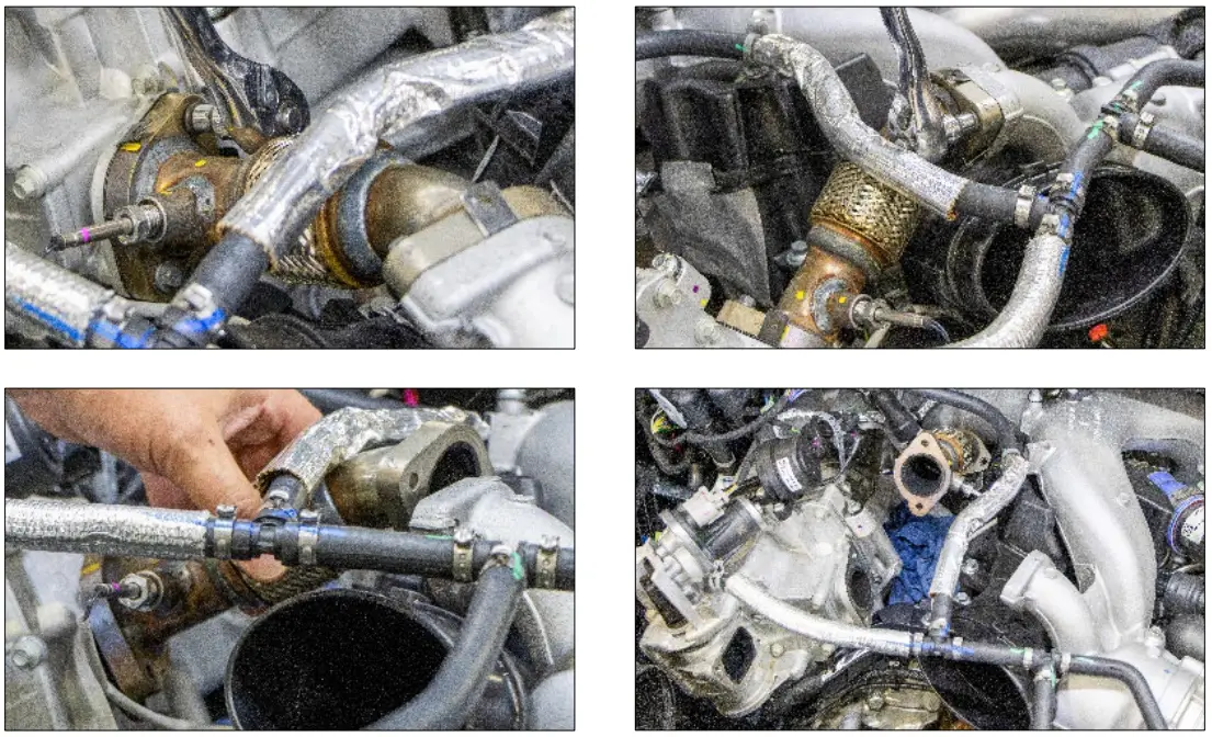 | Remove zip-tube to enable access to EGR cooler inlet and outlet tubes. Remove inlet and outlet EGR cooler tubes, noting the above CAUTION on removing bolts.Identifying the EGR cooler inlet and outlet ports: – EGR inlet is the square port at EGR valve – EGR outlet is the round port CAUTION: EGR outlet tube metal gaskets can have sharp edges. Use caution when handling. Inspect amount of carbon build-up by using a borescope or viewing through the outlet port or by looking at the bottom corner of the EGR cooler through the round outlet port with an inspection light. Suggested EGR cooler flush times: | ![]()