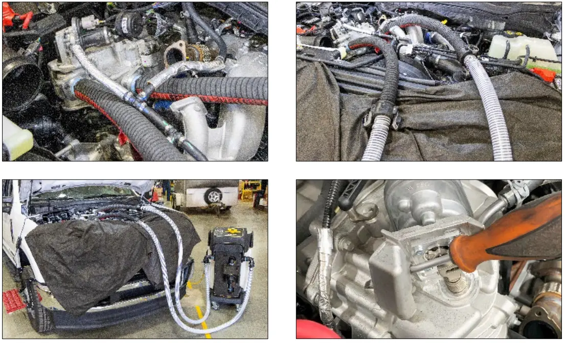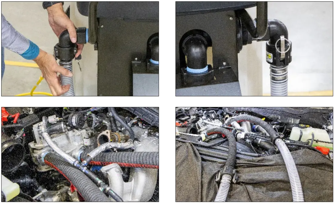 | Secure the white service hoses to the DCF-35 using the provided camlocks. Install the Ford 6.7L EGR inlet and outlet adapter hoses onto the EGR cooler. Connect the white DCF-35 outlet service hose (left side) to the black EGR outlet port adapter hose. Connect the white DCF-35 inlet service hose (right side) to the black EGR inlet port adapter hose.Open the EGR valve using one of the following methods: