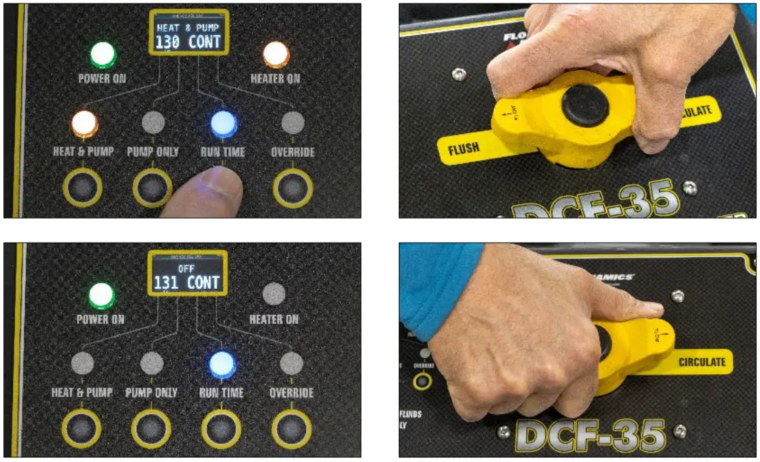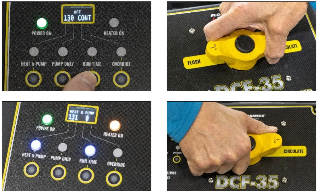 | When the red HEATER ON light turns off, the reservoir temperature is at 130°F and you are ready to flush. Press the RUN TIME button to select desired flush time. Position the Flow Control Valve to FLUSH mode. When the run time has elapsed, the DCF-35 will turn off and the RUN TIME light will flash. Position the Flow Control Valve to CIRCULATE mode. | ![]() |