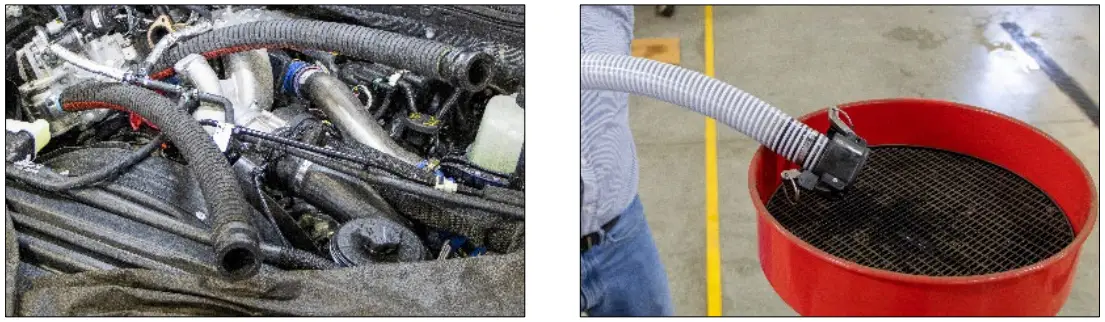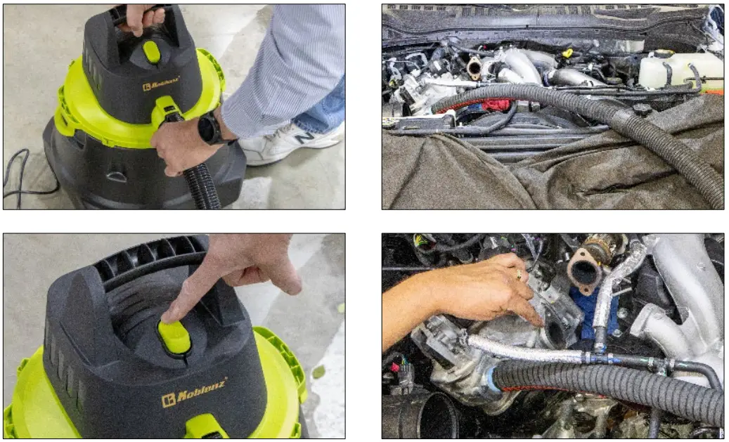 | SHOP-VAC DRAINING AND AIR PURGE PROCEDURE – MUST PERFORM! WARNING: FAILURE TO PERFORM THE SHOP-VAC DRAINING AND VACUUM PURGE PROCEDURE COULD RESULT IN ENGINE FAILURE DUE TO INGESTING REMAINING CLEANER IN EGR COOLER. Connect the suction port of a wet/dry vac to the EGR inlet port adapter hose and turn on for 30 seconds to initially remove cleaning fluid from EGR cooler and hoses. | ![]()