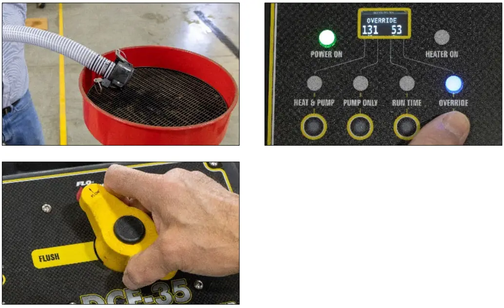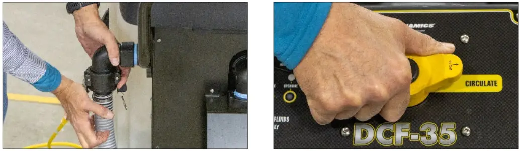 | CAUTION: The DCF-35 has a high flow pump. With the Flow Control Valve fully open in FLUSH mode, the DCF35 will pump at a rate of 45 GPM. Plug the DCF-35’s power cord into an electrical outlet. Connect a service hose to the DCF 35’s outlet connection (left side). Position the Flow Control Valve to CIRCULATE mode. Place the service hose into a suitable waste container. Start the pump by pressing PUMP ONLY and OVERRIDE to disable the low fluid shutoff. Slowly move the Flow Control Valve to the FLUSH position to begin directing flow to the service hose placed in the waste container. When the flow stops, the reservoir is emptied to the lowest level possible using the pump. To drain further, see Complete Reservoir Draining or Flushing procedure.NOTE: Dispose of used cleaner in compliance with local guidelines only. Do not dispose into local drains. | ![]()