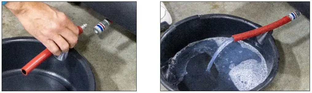 | NOTE: Pressure checking an EGR valve and cooler assembly is not required. If applicable, pressure testing a component can be performed with the component installed on the vehicle. Disconnect inlet and outlet hoses from the component being cleaned. Connect blocked pressure adapter to one outlet and pressure adapter with gauge and regulator to the other. Secure safety cables on each adapter to vehicle or component to prevent becoming airborne if blown off. Connect shop air to pressure gauge, make sure valve is open, and adjust to manufacturer’s pressure check PSI rate or 15 PSI. CAUTION: Do not exceed 25 PSI on any component. Turn valve off and observe amount of pressure decay, noting any decrease on the gauge. Check with manufacturer on the leakage rate that is within their acceptable limits of the component being checked. If component leakage is acceptable, release pressure and remove safety cables and adapters. Proceed to Procedure “A” – Performing a Component Flush. | ![]() |
