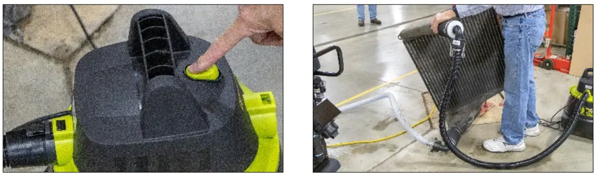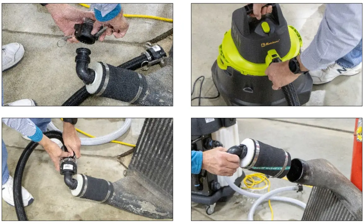 | Remove DCF-35 inlet service hose from bottom component adapter. Switch vacuum hose from the blow port to the suction port and connect the other end to the bottom component adapter. Remove top adapter to increase air flow. Turn on vacuum to air purge and position the component so the bottom adapter is at the lowest point to capture all the cleaning fluid. Air purge with vacuum for 10-20 minutes or until all moisture droplets are removed from component being cleaned. Inspect component being flushed for cleanliness and if needed select a new run time and repeat until component is at the desired cleanliness. Remove adapters. Component is ready to be re-installed. Empty wet/dry vac into a suitable container. NOTE: Dispose of used cleaner in compliance with local guidelines only. Do not dispose into local drains. See “ADDITIONAL FUNCTIONS” draining reservoir procedures to drain reservoir. | ![]()