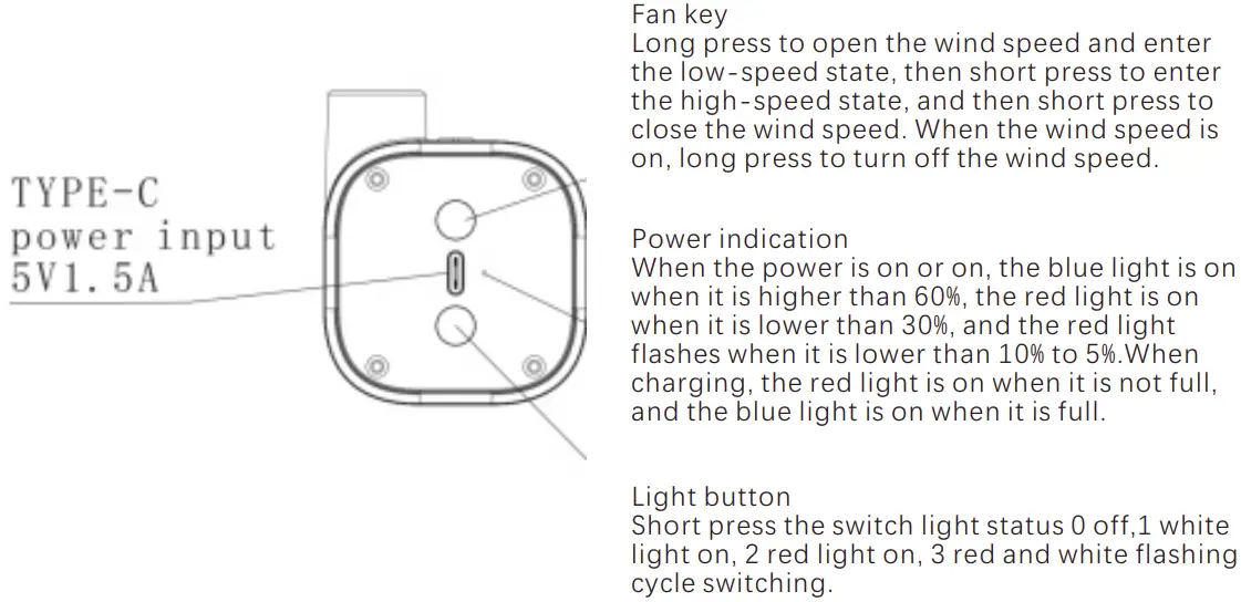 - Fan button: long press to open the fan to enter the low speed state, then short press to switch high and low gear, long press to close the fan.
