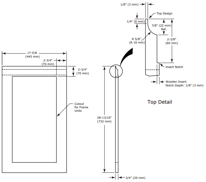 Main panel width Main panel height 17-5/8″ (445 mm) 28-13/16″ (732 mm) - Create the top design for the handleless feature and the 1/8″ (3 mm) notch for the insert(s) indicated on the appropriate Top Detail drawing, on the next page.