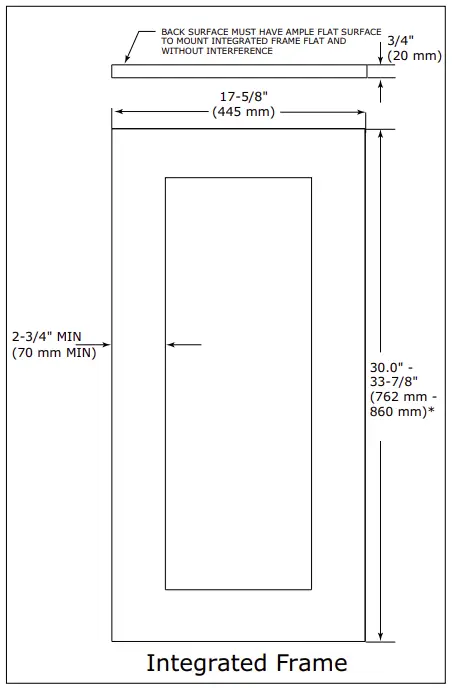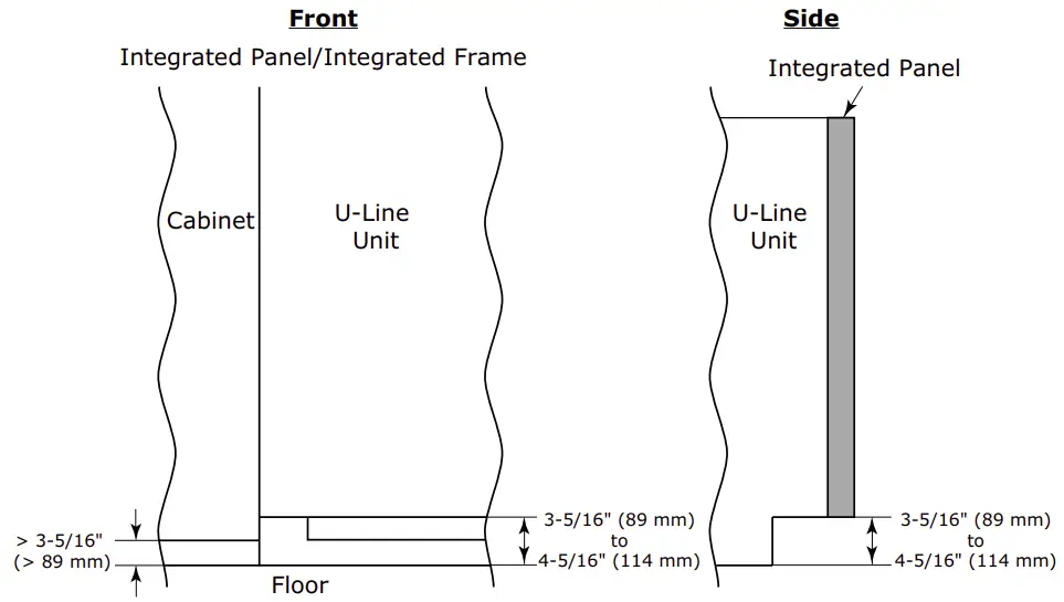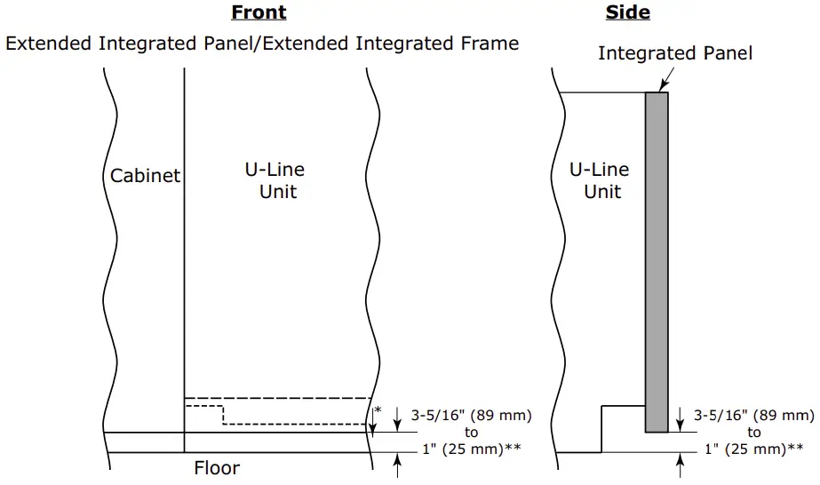 * A minimum of 1″ (25 mm) is required from the floor to the bottom of the extended integrated panel/frame for proper ventilation.