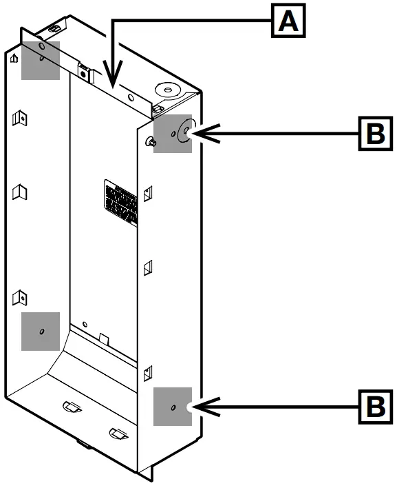 NOTE: If the wall hasn’t been finished yet, be sure to position the enclosure at the correct depth so that it will be supported on the surface when the work is complete. The shoulder of the housing [A] must remain on the surface of the finished wall. - Screw* the enclosure into place on the wall studs using two (2) mounting holes [B], depending on your situation.