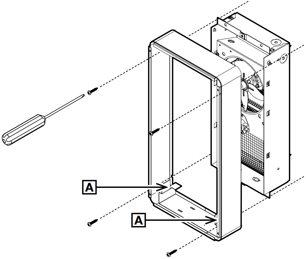 Insert the sleeve around the frame using the guides at the bottom of the frame [A] and screw it to the wall using the four (4) screws (not supplied) in the semicircular cut-outs provided.