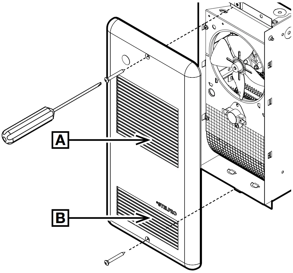 IMPORTANT: Pay attention to the direction of the grille. The opening (A) must always face the fan blades and the opening (B) the hot air outlet. If the grille is installed the wrong way round, the unit will stop working.