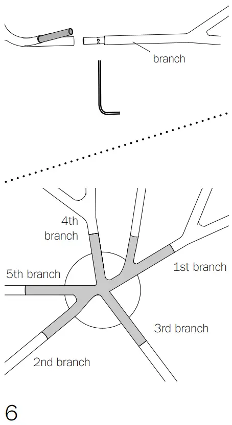 Attach the branch and tighten with a set screw (provided). Attach 2nd branch (if applicable) opposite to the first branch so the system is balanced during installation. Repeat steps as necessary.