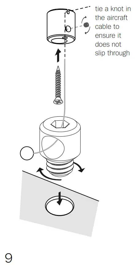 Locate a swag hook directly above the set screw. Using the screws provided, fasten it into the ceiling. Pass the aircraft cable through the small hole on the bottom of the swag hook and thread it through until it emerges from the top parallel to the ceiling. Pull until tight, and tighten set screw on side.