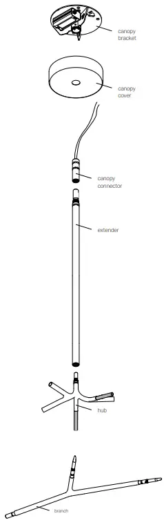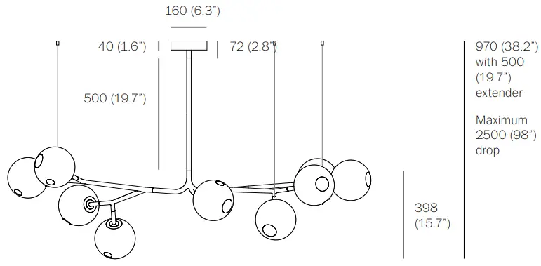| EXTENDER: | available in 150mm (5.9”), 250mm (9.8”) / 500mm (19.7”) / 1200mm (47.2”) / 750mm (29.5) (attached with 2 pendants). Up to 2.5m (98”) drop. |
