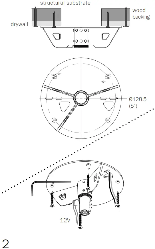 - Measure and mark fixture location on the ceiling. Ensure the ceiling in this location has adequate structural support for the canopy bracket. Wood backing at least 3/4″ (19mm) thick is recommended.