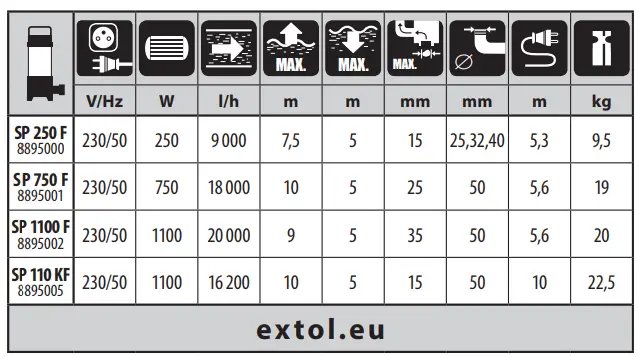 - The electric submersible pump Extol ® Craft 414122 is intended for pumping, draining or transferring water and is intended for domestic, garden or recreational use. Due to its ability to pump larger particles, it is also suitable for pumping dirty water. The pump is designed for smaller pumping applications and it is not recommend to leave it in the pumped liquid long term, e.g. long term submersion in drainage sumps for the purpose of controlled drainage of rising ground water, etc.