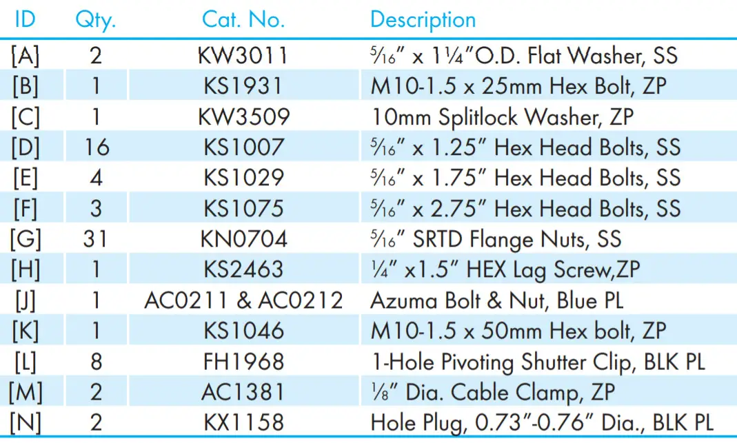 | Each Crate Includes 1 – 36” Orifice Panel, Fiberglass Fan, Sub-Assembly 1 – Motor 1 – Drip Shield, AL 4 – Cone Sections, PL 1 – Cone Guard 1 – Inlet Guard 4 – Cone/Strut Mounting Brackets, GZ 1 – Motor Mount Stiffener Bracket, GZ 1 – Bulk Parts Package (BK1149) | BK1149 – Bulk Parts Package for WM36K 1 – Motor Base Bracket, CTD-GZ 1 – Belt Tensioner Bracket, CTD-GZ 1 – Motor Sheave, C.I. 1 – V-Belt, A-Section 1 – 3” Idler Pulley, A-Section C.I., Blue 1 – Rotary Tensioner Arm, AL 1 – Hardware Package (HP1177) 1 – Coated Cable with Ferrule, 100”L. |