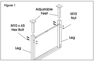 - Flip legs (1) upside down. Place adjustable feet (2) into legs and slide to desired height. Fasten adjustable feet to legs with two M10 x 65 hex bolts and two M10 nuts per adjustable foot using a 17 mm wrench. (See Figure 1)