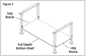 - Turn legs upright and spread apart to accommodate full depth bottom shelf. Place full depth bottom shelf (6) across leg braces. (See Figure 2)