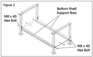 - While bottom shelf is sitting on leg braces, slide two bottom shelf support bars (7) underneath shelf and line them up with outer holes in leg brace and shelf. Fasten support bars to shelf and leg brace with four M8 x 40 hex bolts per support bar using a 13 mm wrench. Fasten center of leg brace and shelf together with four M8 x 40 hex bolts and M8 nuts using a 13 mm wrench. Do not tighten fully. (See Figure 3)
