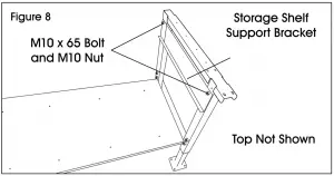 - Place two storage shelf support brackets (5) onto inside of legs with lip side facing down and inside frame. Fasten each support bracket to legs with two M10 x 65 hex bolts and two M10 nuts using a 17 mm wrench. (See Figure 8)