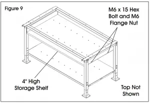 - Slide 4″ high storage shelf (4) onto lip of storage shelf support brackets. Line up two holes located on side of shelf with two holes in support brackets. Fasten shelf to support brackets with four M6 x 15 hex bolts and four M6 flange nuts using a 10 mm wrench. (See Figure 9)