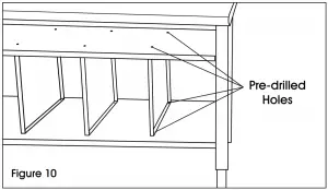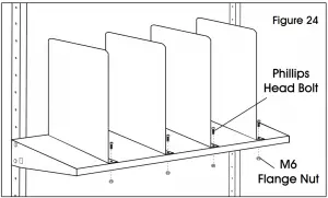 - Six box shelf dividers (10) are included with box shelf. To attach, line up front and rear pre-drilled holes on top of shelf. Fasten each divider with two Phillips head bolts and two M6 flange nuts using a Phillips screwdriver and 10 mm wrench. (See Figure 24)