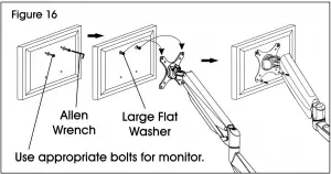 - Easy-adjust monitor mount includes a built-in counterweight system for free-range motion. Arm in mount may need to be adjusted to allow monitor to stop at desired position. Attach monitor to plate. (See Figure 16)