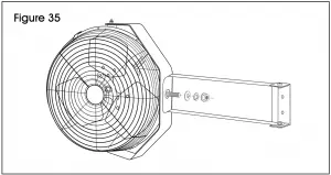 - Align hole on the opposite end of fan mounting bracket to the hole on the crescent fan bracket. Attach using M12 x 20 mm hex bolt, M12 washer, M12 lock washer and M12 hex nut. (See Figure 35)