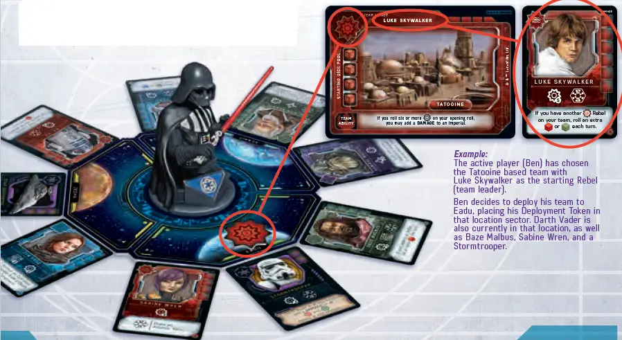 The active player chooses where to deploy their teamby placing their Deployment Token in one of the three location sectors of the Deployment Zone. During their turn, players can only interact with the three face-up Asset Cards at this location and the Rebels on their team (who are also present in the chosen location). unless an ability says otherwise.