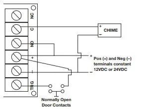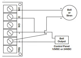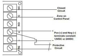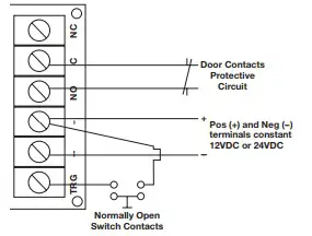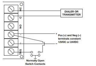For this application a resistor [for 12VDC – 2K (2,000 Ohm) or for 24VDC – 4.7K (4,700 Ohm)] must be installed as shown (resistor not supplied).