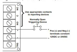 Note: When triggering via a N.O. (normally open), momentary or maintained trigger, connect the dry contact trigger to Pos (+) and TRG terminals. When triggering via a N.C. (normally closed), momentary or maintained trigger, connect the trigger to Neg. (–) and TRG terminals and install a resistor [for 12VDC – 2K (2,000 Ohm) or for 24VDC – 4.7K (4,700 Ohm)] between the Pos (+) and TRG terminals (Fig. 9).