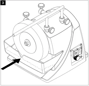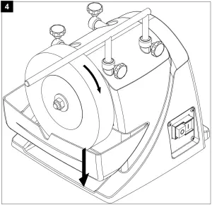 Fill the water reservoir with water up to the marking. The grinding stone becomes saturated with water. Refill water, if required. Do not grind without water. Once the grinding process is completed, lower the water reservoir to prevent the grinding stone from being in the water for an extended period of time. Empty the water reservoir regularly. Otherwise, particles of steel and trimmed stone will accumulate and compress in the reservoir.