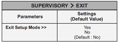 | Exit Setup Mode >> | No Yes (Default : No) |