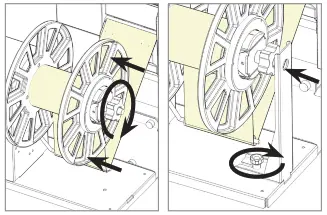 ![]() | STEP 6 Once the media is loaded into the printer, slide left and right the unwinder to find the correct alignment between the two units and tighten the knobs. |
