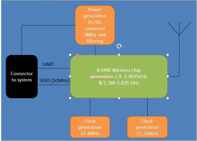 The 50165 has two crystals. One 32.768 kHz low power oscillator for low power mode timing and one 37.4 MHz reference clock. Via the connector the module is powered with 5VDC and internally 3.3VDC are generated and filtered. The wireless connectivity is based on the B-Link BL-M3455AT1(BL-6255) chip.