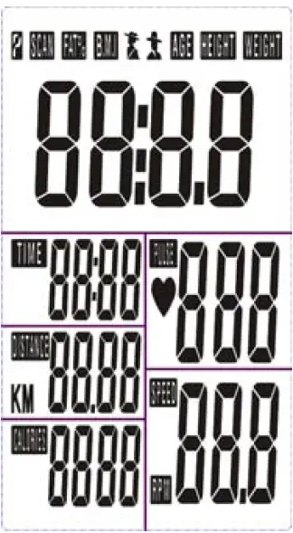 SCAN: Cycles through all functions from TIME, DISTANCE, CALORIES, PULSE, RPM/SPEED.