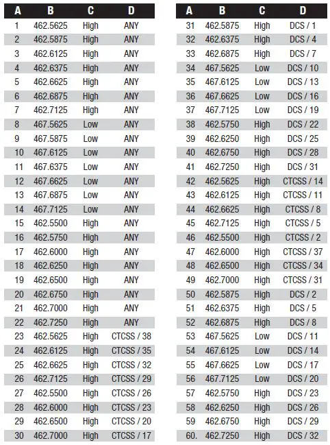 A = Channel No. for 60 Channel Models