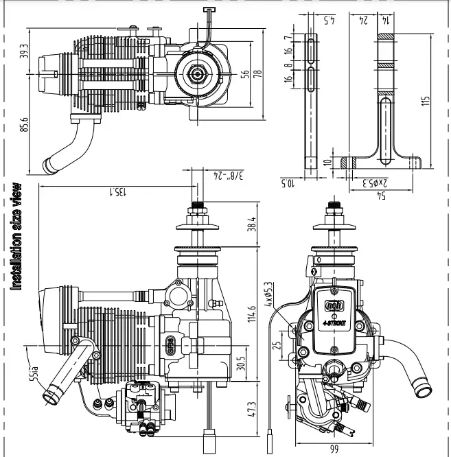 NGH-GF38 4-stroke engine need to use rail bracket mount on a suitable RC aircraft. It can effectively reduce the high frequency vibration of four-stroke engine running at a high speed. As shown below: