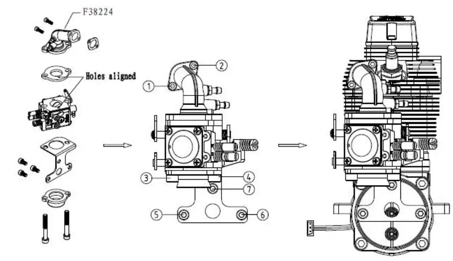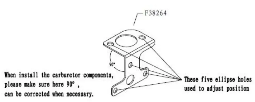 Following the above pictures connect the carburetor. Please attention the five ellipse holes and 90° of the mounting bracket (F38264), and these five ellipse holes used to adjust position. Mounting bracket at 90 degrees can be intake manifold (F38224) and the mounting surface integrity (If not 90°, it must be to adjust). Make sure the intake manifold (F38224) will not rupture by pull down and up compressions. Above pictures ①-⑦ are fastening screws. Please don’t take them all tighten at a time. You should adjust the mounting bracket position and make sure the intake manifold is not subject to tension and extrusion, and then tight the fastening screws one by one (according the situation ⑦ cannot install ).