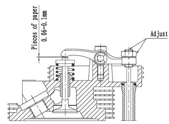 Remove the rocker arm cover and revolve the propeller slowly clockwise by hand. The intake side rocker arm stops, and by turning it, the piston reaches the compression top dead center (TDC). In this position, take a small piece of paper (thickness 0.06 – 0.1mm) into between rocker and valve. With a hexagonal wrench adjustment, after that, tighten the hex nut (note the hexagonal nut should not be screwed too tight), as shown in the figure below.