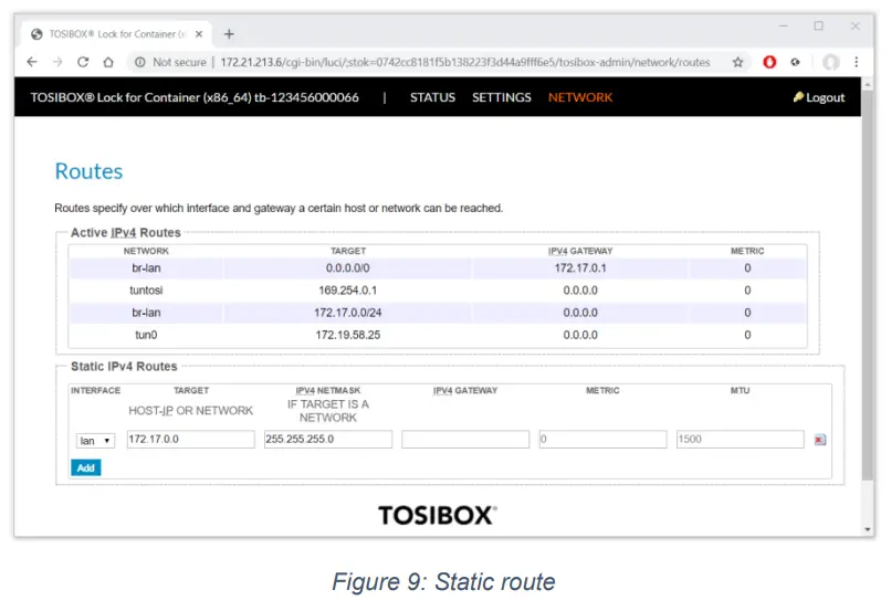 By default, TOSIBOX® Lock for Container does not have access to the host device or to the LAN devices residing in the same network as the host device itself. You can access the LAN side by configuring static routes on the Lock for Container. Log in as admin and go to “Network > Static routes”. On the Static IPv4 Routes list you can add a rule to access the subnetwork.