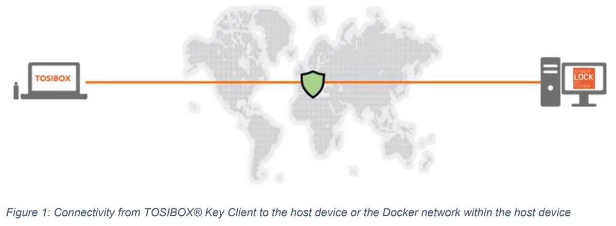 TOSIBOX® Key used is the starting point for the VPN tunnel - TOSIBOX® Lock for Container is the endpoint of the VPN tunnel providing secure remote connectivity to the host device where it’s installed