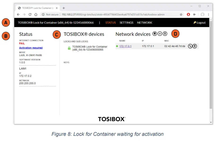 When TOSIBOX® Lock for Container is not activated, the web user interface displays the “Activation required” link on the Status area. Clicking the link takes you to the activation page. An activation code from Tosibox is required for activation. An inactive Lock for Container does not communicate to the Internet, so the Internet Connection status displays FAIL until the Lock for Container is activated.