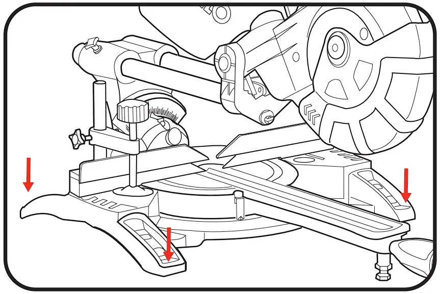 - Ensure the mitre saw is mounted or placed on a level, firm wok surface before use. A level and firm work surface reduces the risk of the mitre saw becoming unstable.