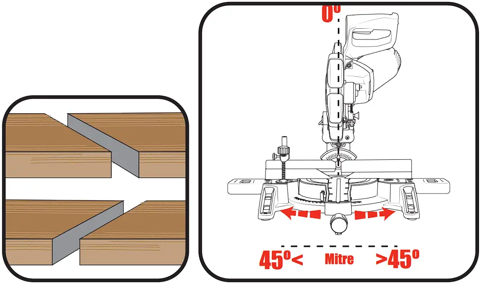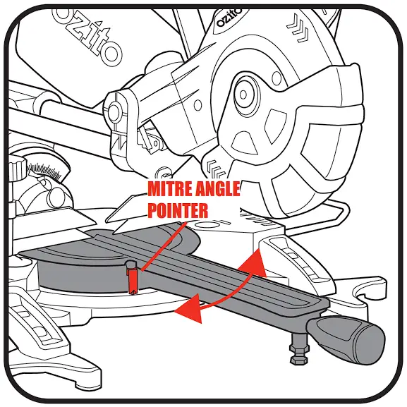 - Rotate the mitre table to the desired mitre angle (left or right) as shown by the mitre angle pointer